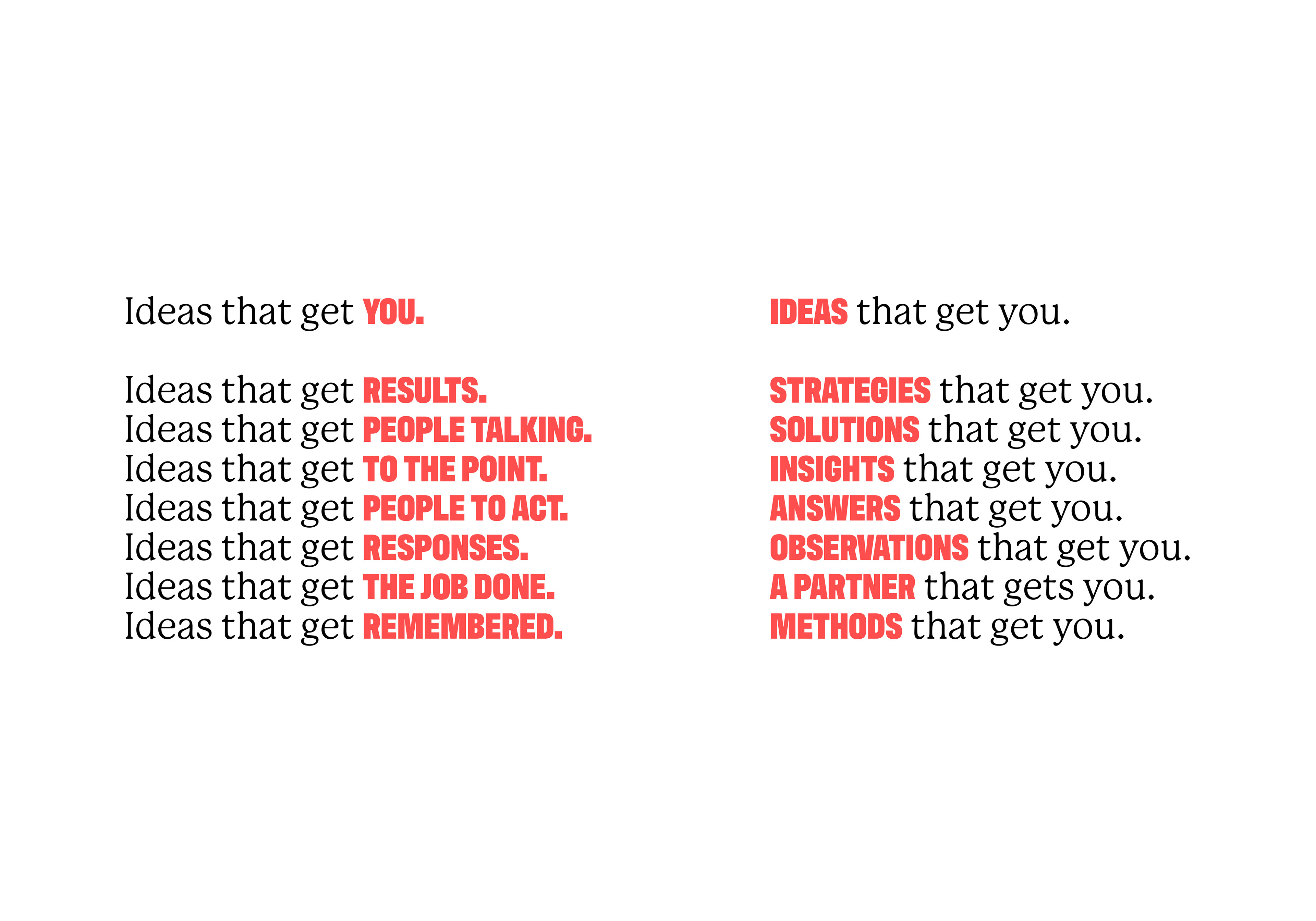 Branding yourselves might — ironically — be the toughest task at a creative agency. I initiated a series of internal interviews and discovered that we are driven by the client relationship more than anything else. Using that key insight, I crafted the big idea, developed a voice with endless possibilities, and directed the design.